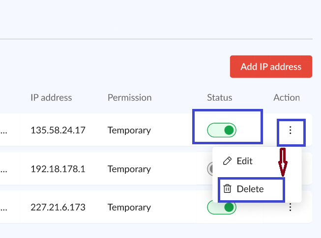 To remove an IP address from the allow list, click the Delete icon and confirm the action.