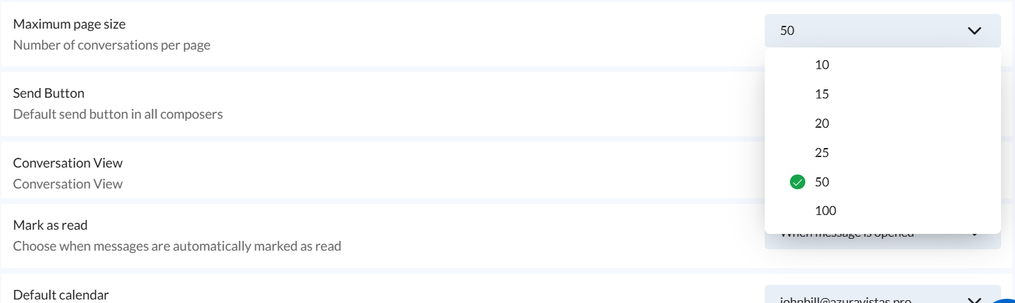 Adjust Maximum Page Size based on your preference for scrolling through emailsβuse a lower value for faster page loads.