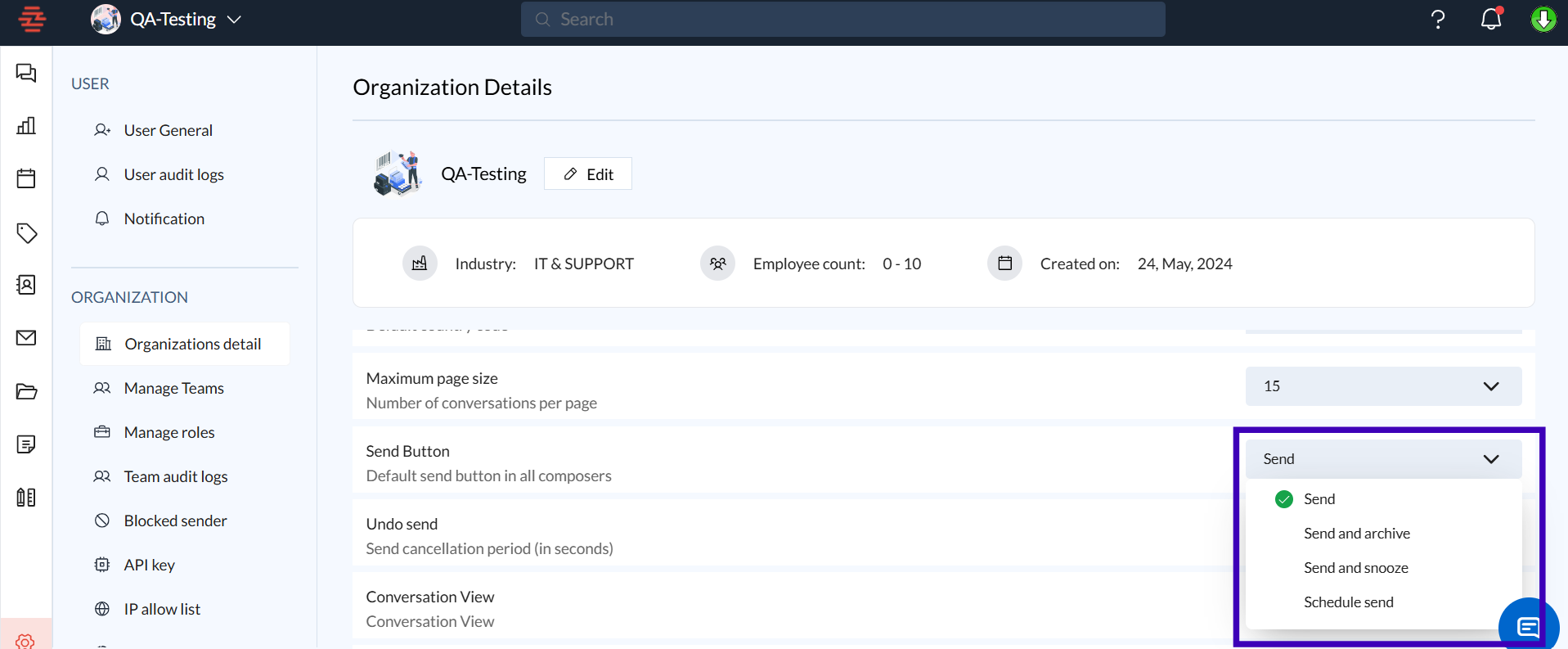 Choose the default behavior of the send button across the organization, such as "Send" or "Send & Archive."