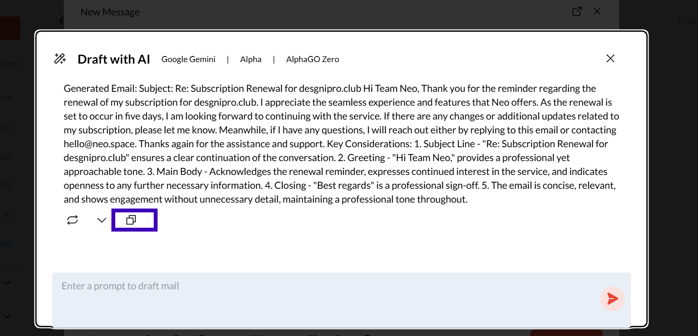 Once the AI-generated draft appears, click the Copy icon to copy the draft text.