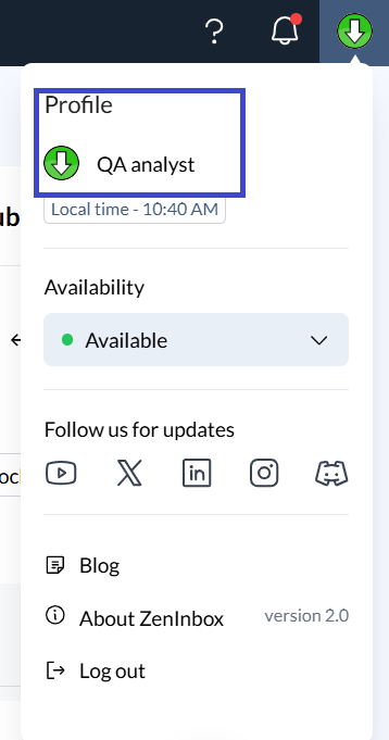 The Profile section in Zeninbox, accessible from the top right corner of the interface, allows you to manage your availability status, view local time, and access various account-related options. Itβs designed to give you quick access to essential settings and resources, making it easier to stay updated and maintain control over your Zeninbox experience.