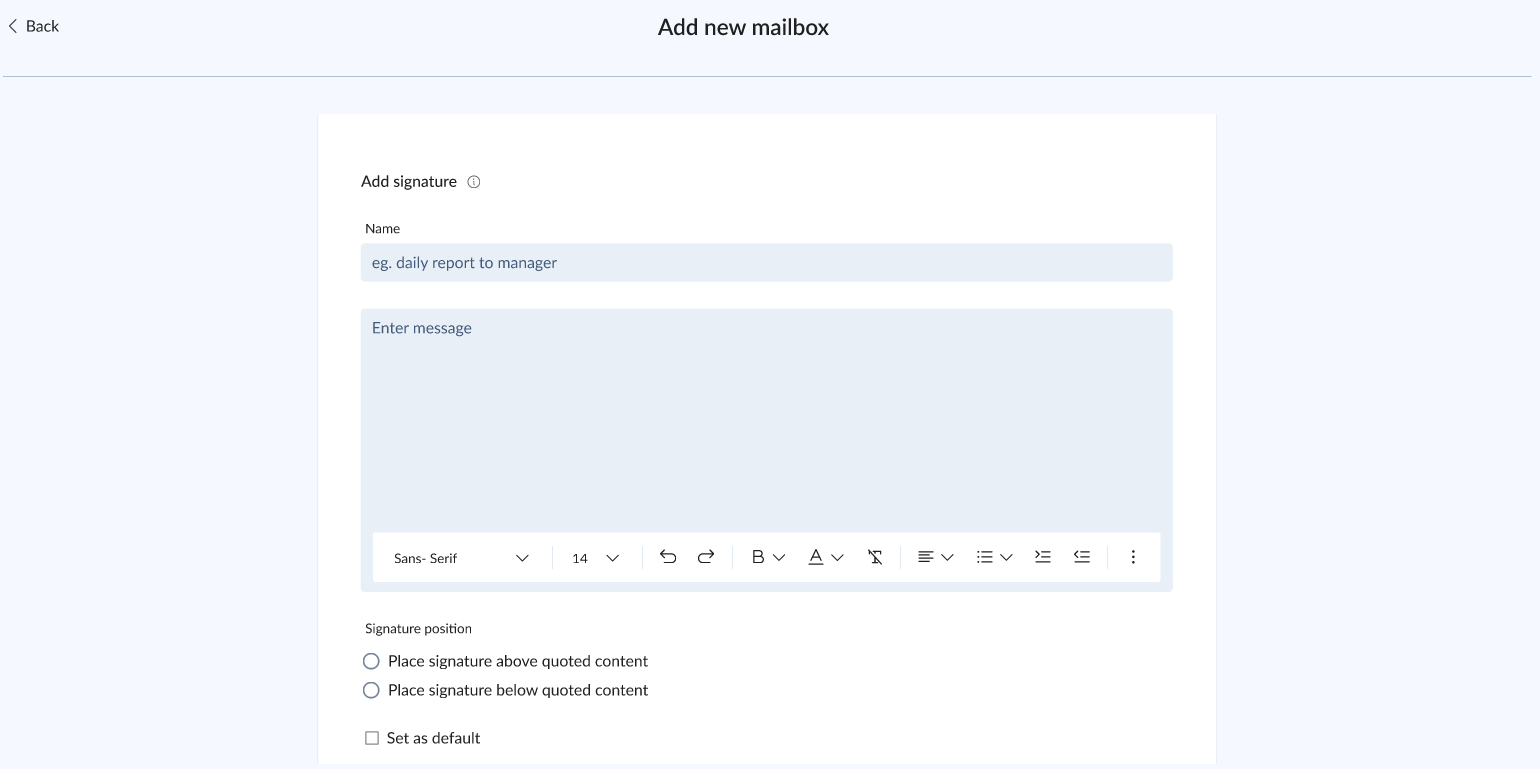 Zeninbox allows you to set up a custom signature for each mailbox.