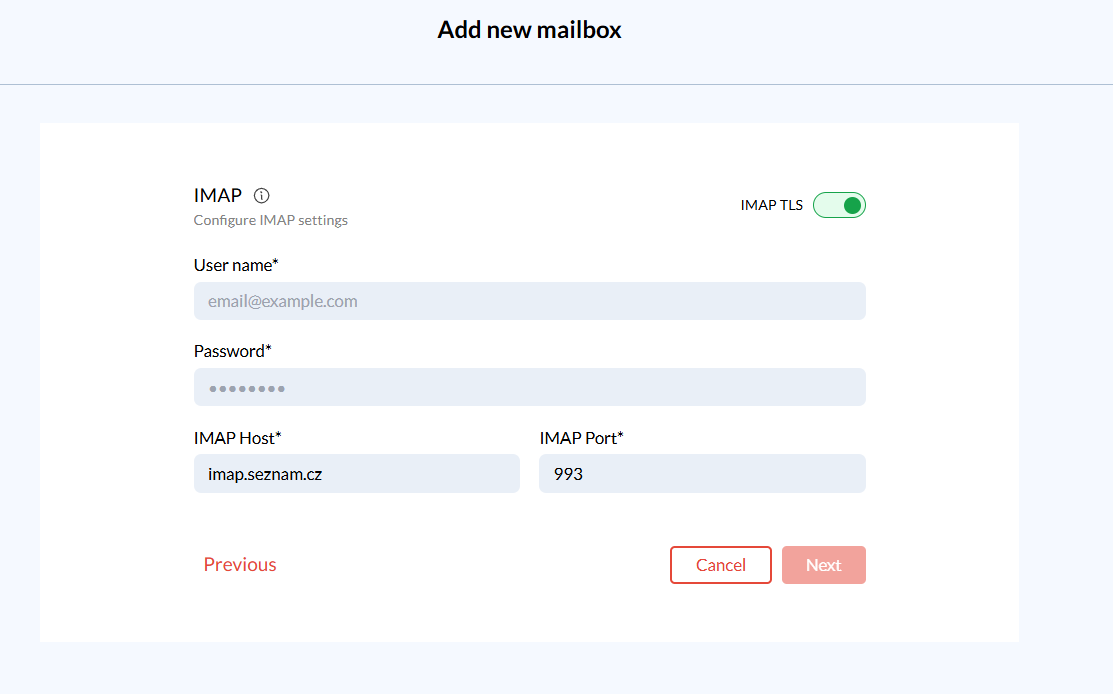 On the Add New Mailbox screen, select the IMAP/SMTP option to manually configure Seznam email.