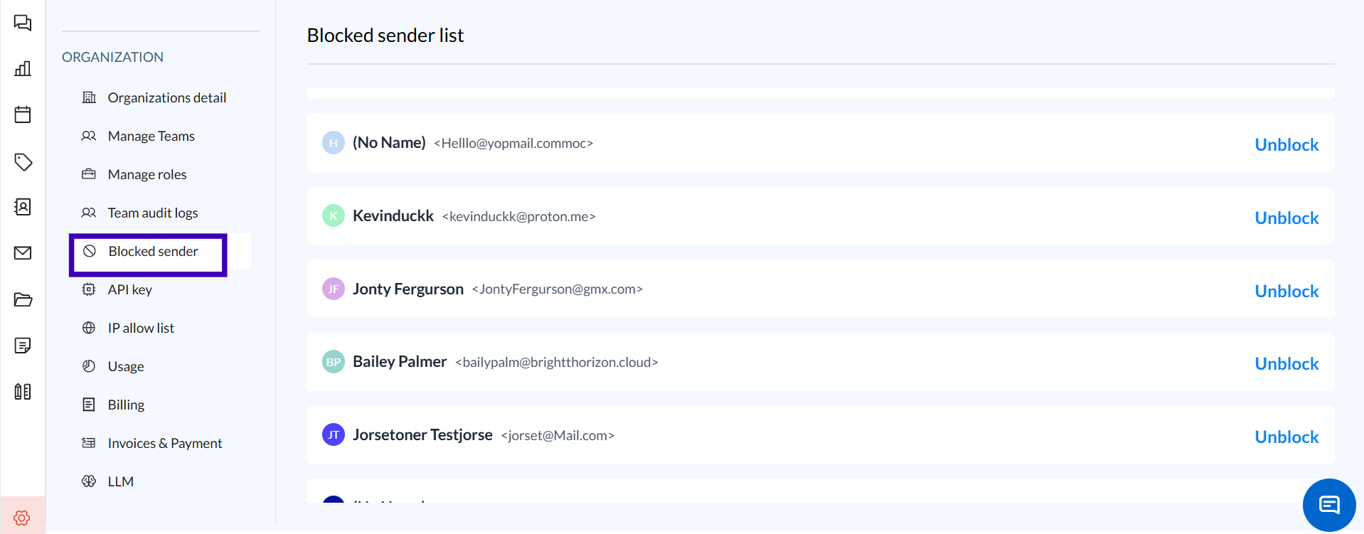 Navigate to the Blocked Sender section under ORGANIZATION in the sidebar.