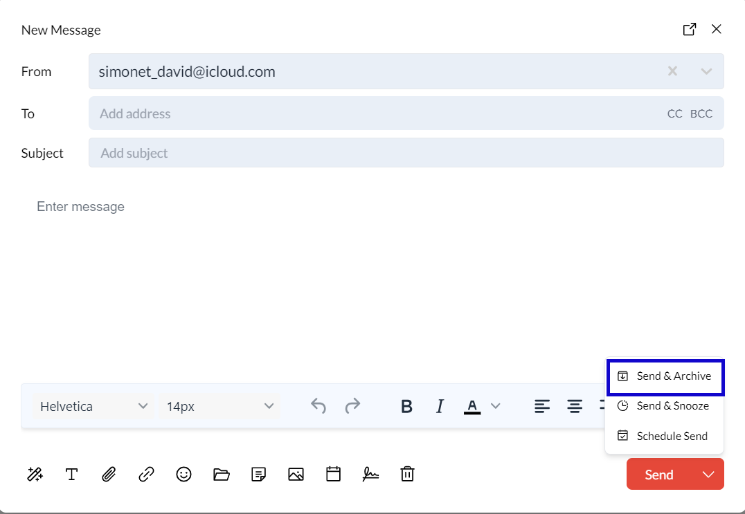 Send your email and automatically move the conversation to the archive, keeping your inbox clean while ensuring the message is stored for future reference.Send & Snooze