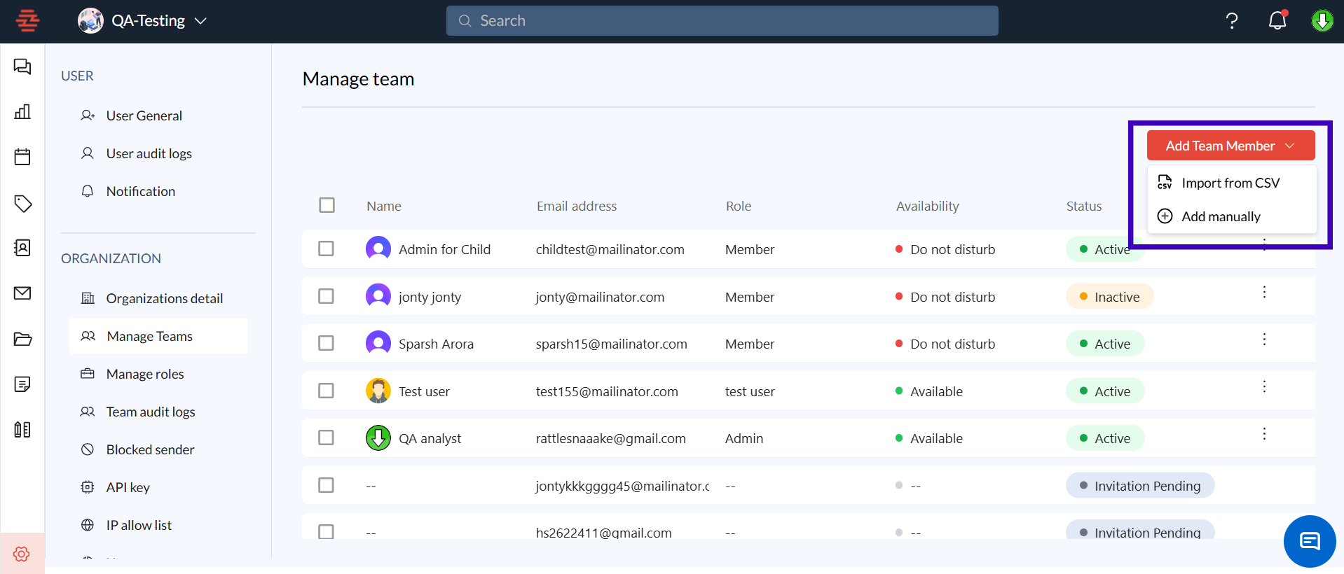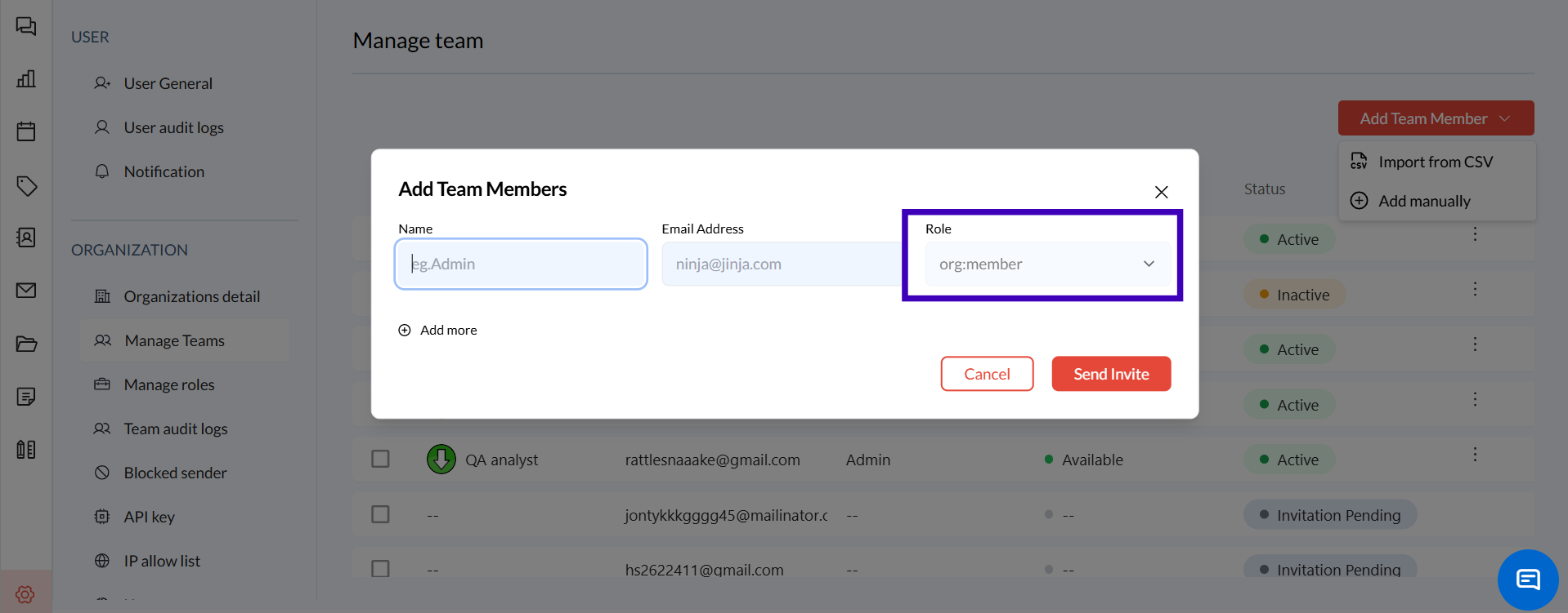 This will open a new pop window where you can enter the details of the teammate you wish to invite by adding both manual and CSV files.