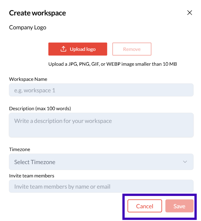 Name your workspace and provide a brief description of its purpose (e.g., Sales Team, Customer Support).