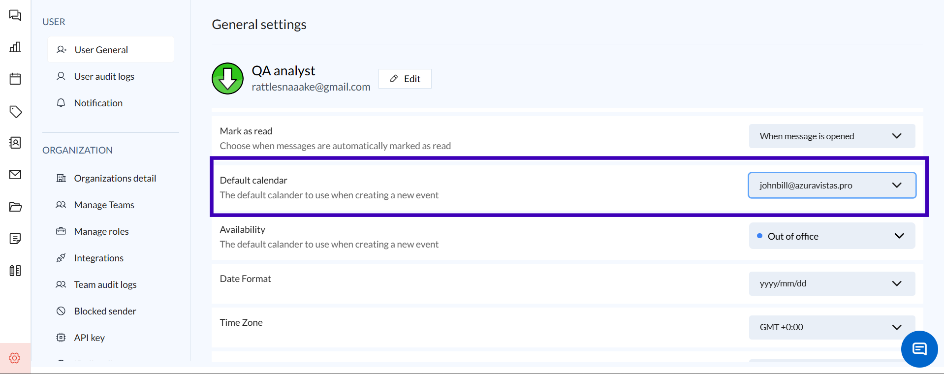 In User General, Select "Default Calendar" from the drop-down menu.