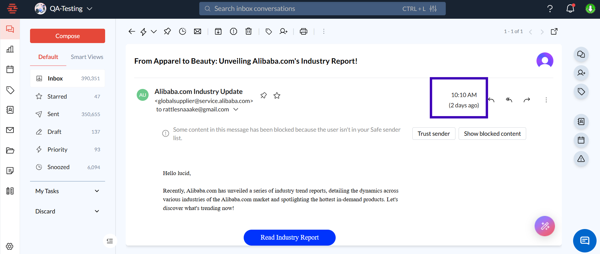 Check the Sent and Received Times: The sent timestamp is displayed next to the sender’s information, while the received timestamp is visible above the message body.