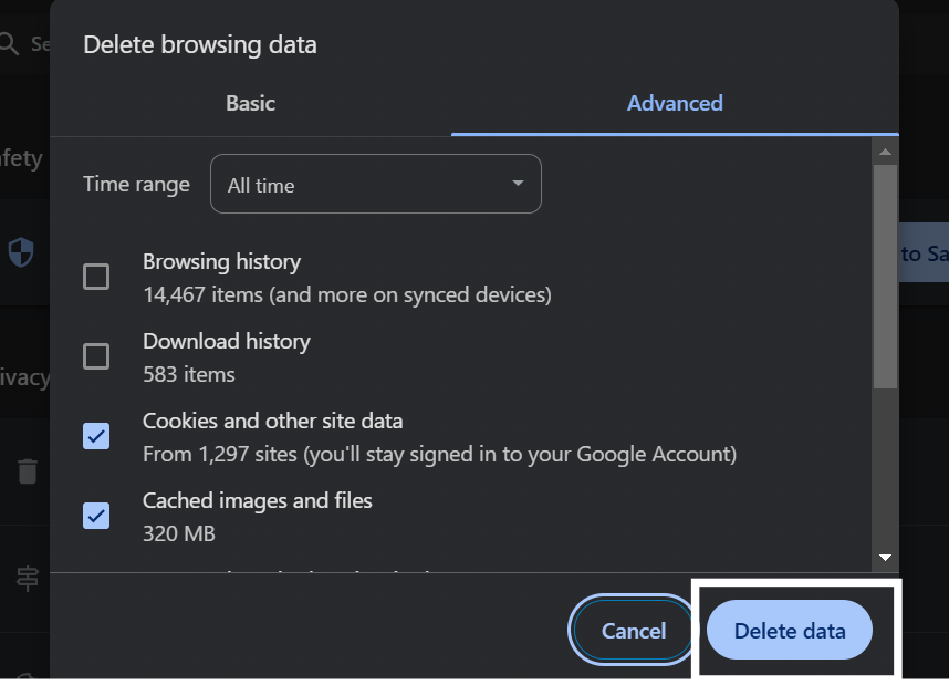 Select Cookies and other site data and Cached images and files, then click Clear data.