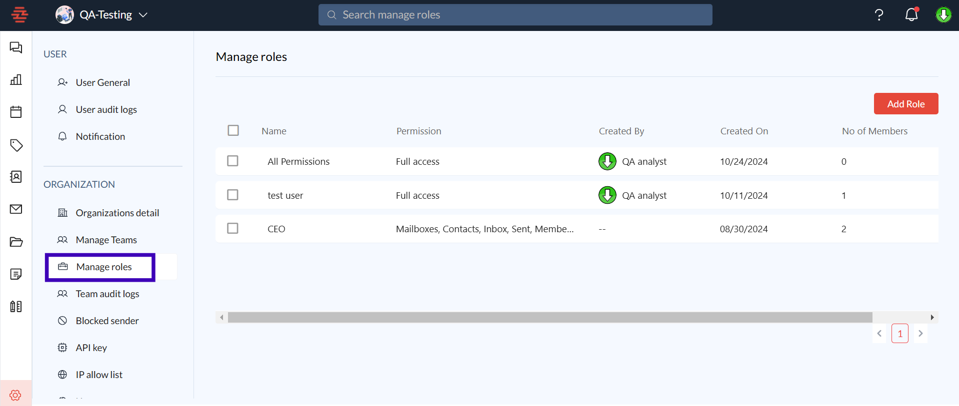 This will take you to the Role Management Dashboard, where you can view all existing roles, their permissions, creators, creation dates, and the number of users assigned to each role.