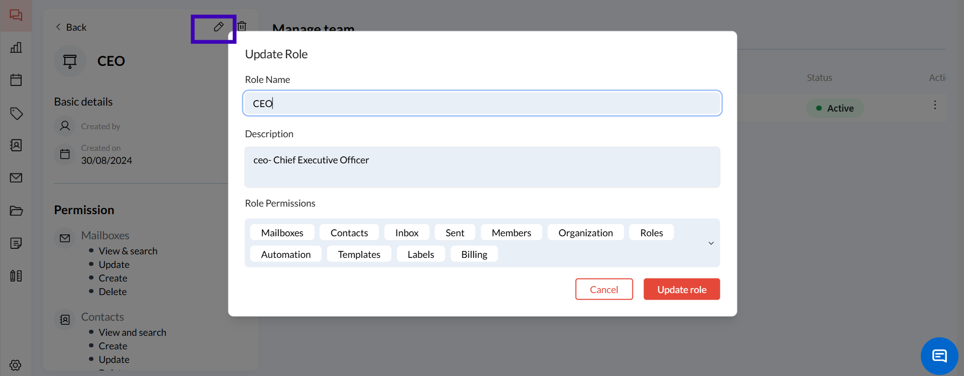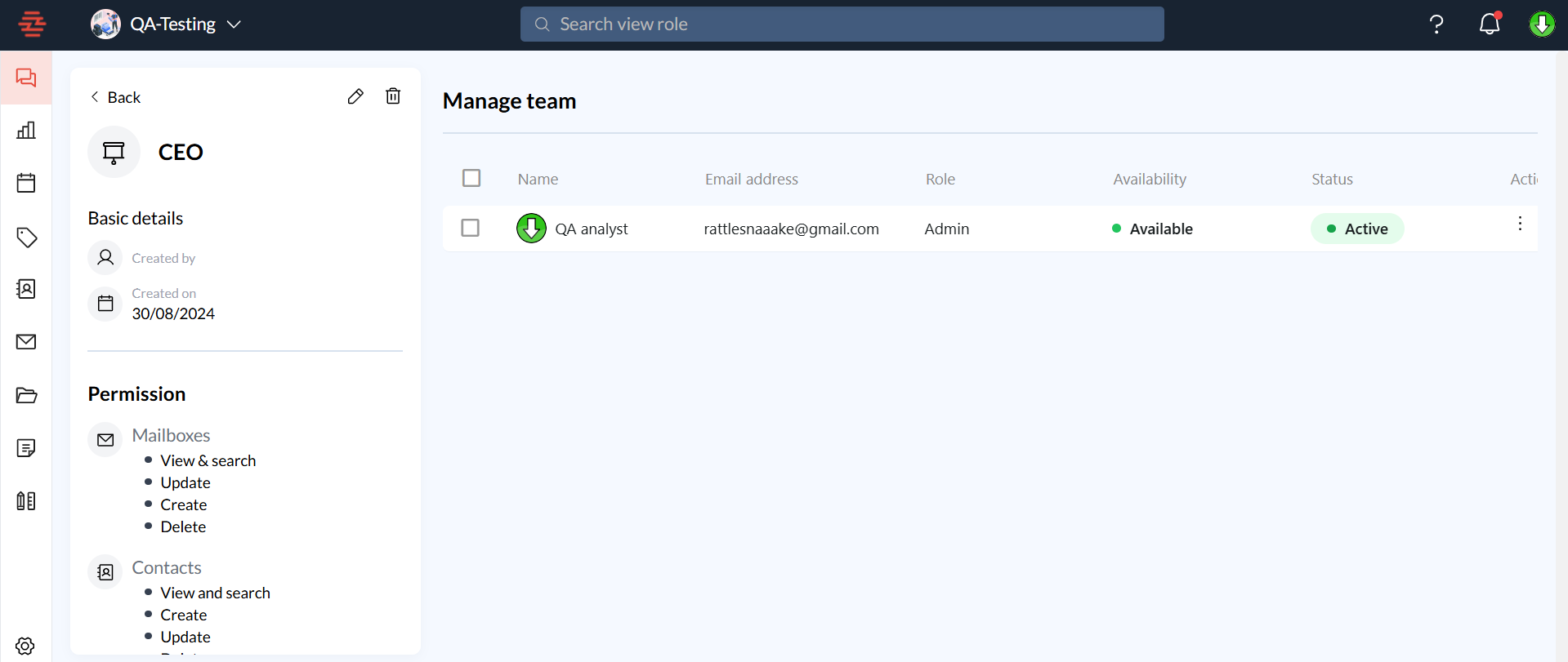 Permissions: A detailed list of actions this role can perform, such as viewing, creating, updating, or deleting items in the mailbox, contacts, or team members.