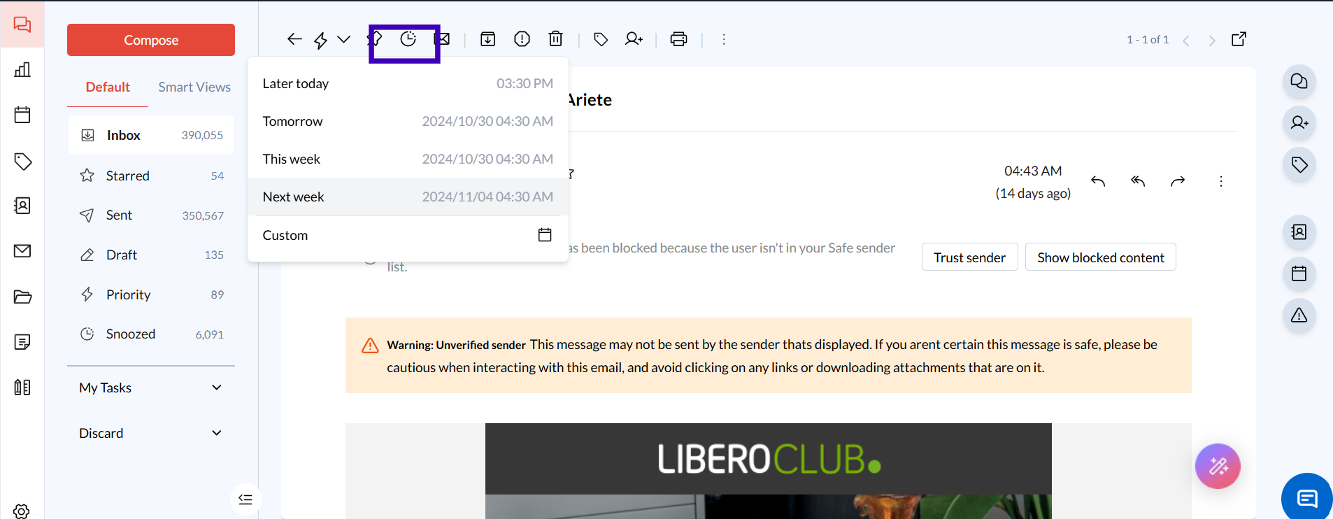 Click on the Snooze Icon: Look for the “Snooze” icon in the email toolbar.