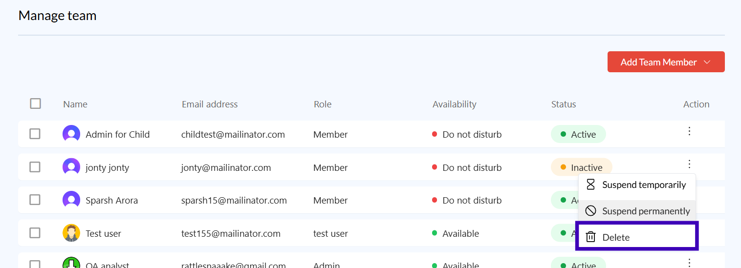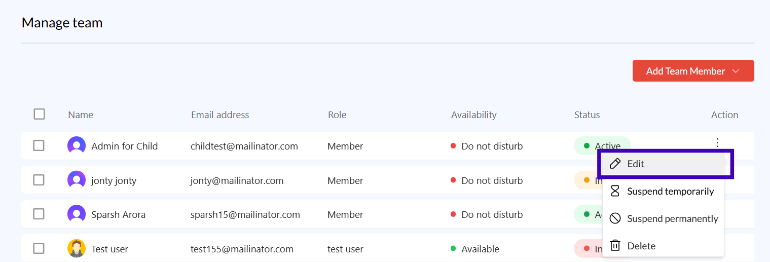 This will bring you to the Manage Teams dashboard, where you can see a list of all current team members, their roles, availability, and status.