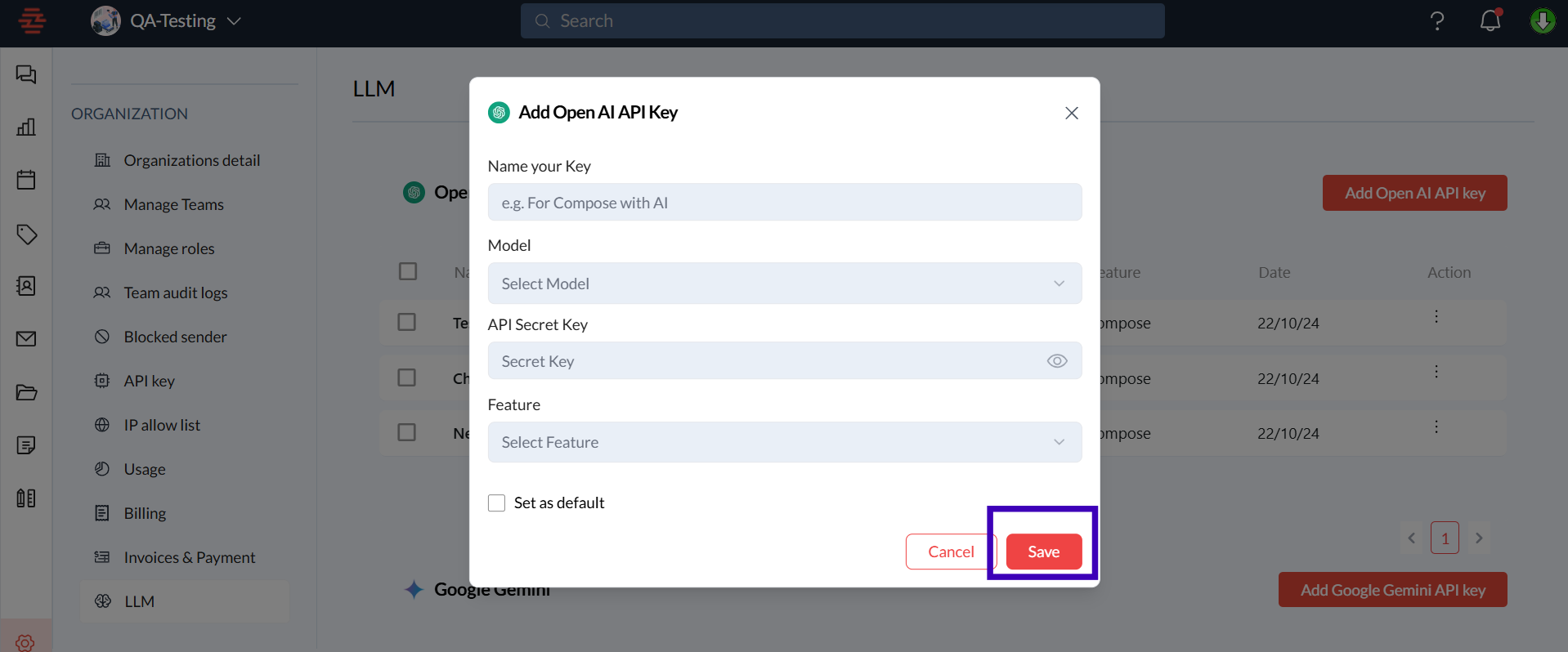 To add a new key, click Add Open AI API Key or Add Google Gemini API Key.